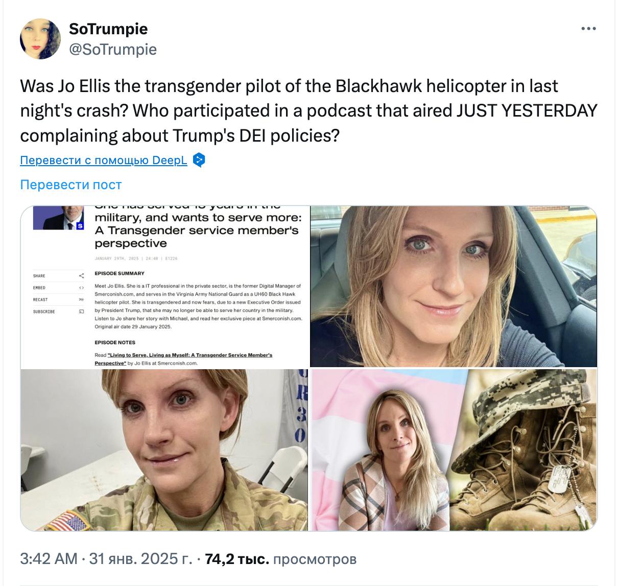 "За чутками, трансгендерна жінка Джо Елліс була пілотом вертольота Black Hawk, який зіткнувся в повітрі з літаком American Airlines. Хоча її особистість привернула значну увагу у соціальних мережах, інформація залишається офіційно непідтвердженою владою", - пише Santa Monica Observer.