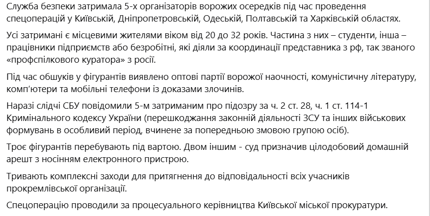 Служба безпеки України затримала п'ятьох членів організації "Робітничий фронт України", які намагалися створити "повстанський рух" та "солдатські комітети".