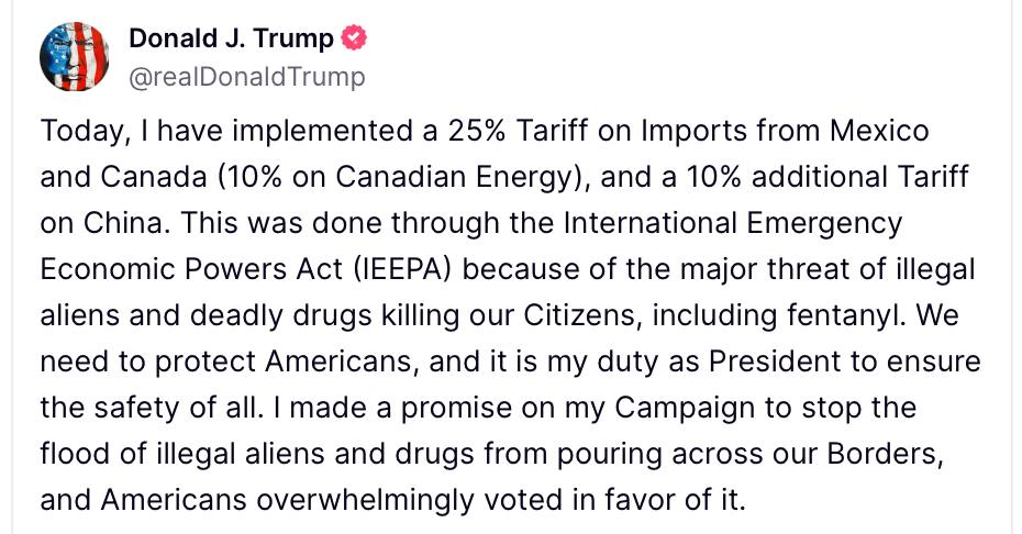 Президент США Дональд Трамп видав указ про введення з 4 лютого 25% мита на імпорт з Мексики та Канади (за винятком для канадських енергоносіїв, тариф за якими буде 10%). Також 10% мито ввели на товари з Китаю.