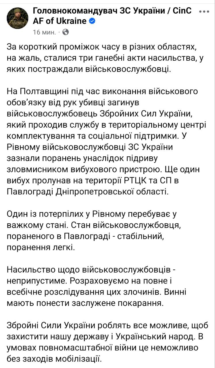 "У Полтавській області під час виконання військового обов'язку від рук убивці загинув військовослужбовець Збройних сил України, який проходив службу у ТЦК та СП (територіальному центрі комплектування та соціальної підтримки). У Рівному військовослужбовці ЗСУ отримали поранення внаслідок підриву зловмисником вибухового пристрою. Ще одинвибух стався. на території РТЦК та СП у Павлограді Дніпропетровської області. Один із постраждалих у Рівному перебуває у важкому стані.