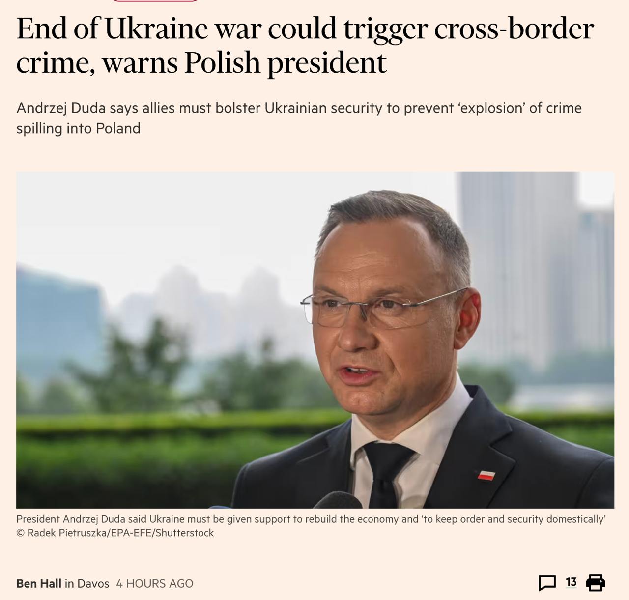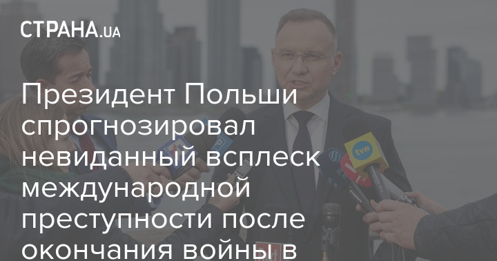 Президент Польщі Анджей Дуда заявив, що завершення війни в Україні та повернення з фронту тисяч чоловіків можуть призвести до вибухового зростання міжнародної організованої злочинності. При цьому, на його думку, багато військових мають проблеми з психікою.