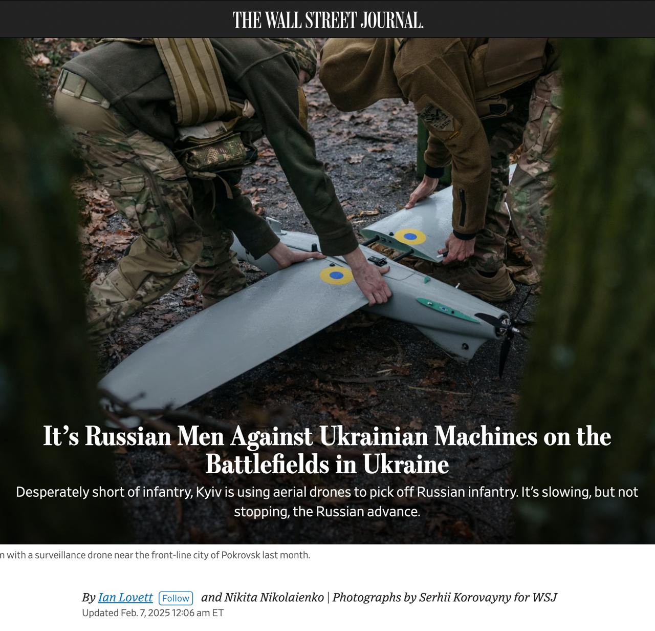 Києву катастрофічно не вистачає піхоти і він використовує безпілотники, щоб відстрілювати російську піхоту. Це сповільнює, але не зупиняє російський наступ. Росія має на фронті чисельну перевагу в людях 5 до 1, а подекуди і 10 до 1.