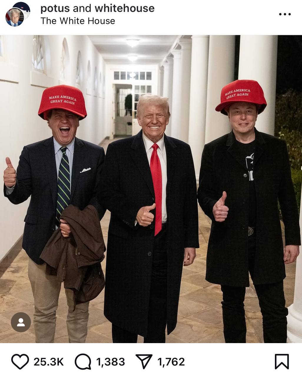 Разом із Дональдом Трампом Маск і Карлсон попозували у великих кепках із девізом республіканця "Make America Great Again" ("Повернем Америці колишня велич").