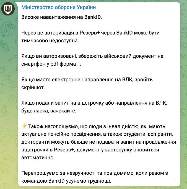 Проблеми з доступом до програми "Резерв+" пов'язані з високим навантаженням на BankID.
