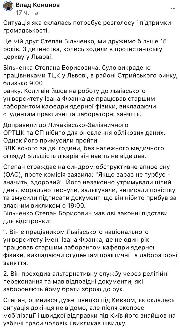 "Більченка Степана Борисовича викрали співробітники ТЦК у Львові, в районі Стрийського ринку, близько 9:00 ранку. У цей момент він прямував на роботу до Львівського університету імені Івана Франка, де працював старшим лаборантом кафедри ядерної фізики, проводячи для студентів практичні та лабораторні заняття.