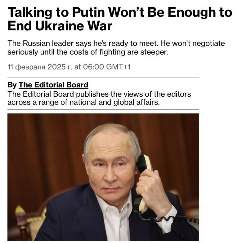 Агентство Bloomberg у своїй редакційній статті пропонує США замість переговорів із російським лідером Володимиром Путіним перейти до заходів "посиленого західного економічного та військового тиску" на Росію, а також до довгострокових гарантій безпеки для України.