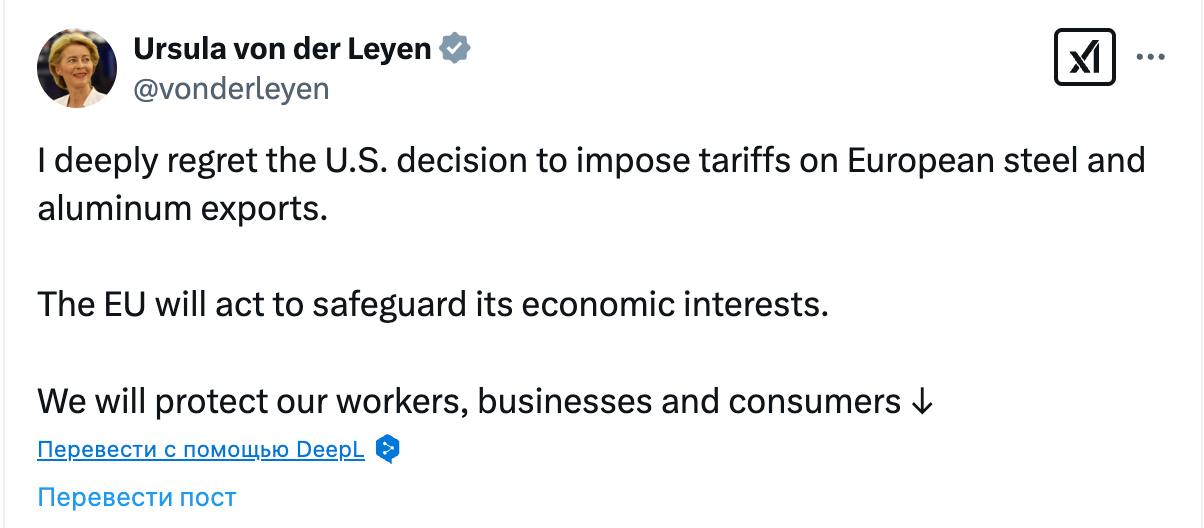 "Я глибоко шкодую про рішення США ввести тарифи на європейський експорт сталі та алюмінію. ЄС діятиме на захист своїх економічних інтересів. Ми захищатимемо наших робітників, підприємства та споживачів", - написала у Х глава Єврокомісії Урсула фон дер Ляйєн.