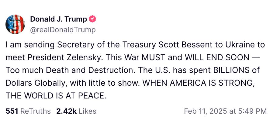 "Я відправляю міністра фінансів Скотта Бессента в Україну для зустрічі з президентом Зеленським. Ця війна має незабаром закінчитися - занадто багато смертей і руйнувань. США витратили мільярди доларів по всьому світу, але мало що показали", - написав президент США.