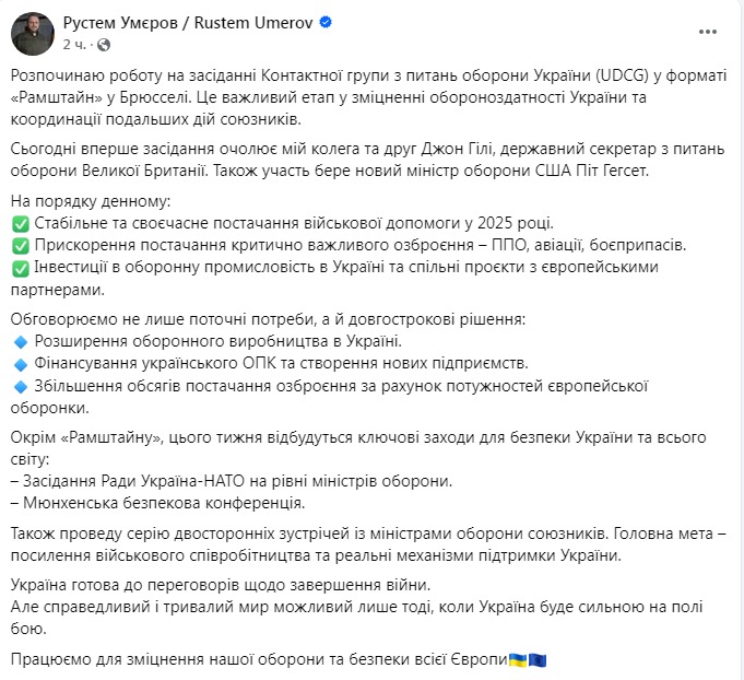 За його словами, розпочато роботу на засіданні контактної групи з оборони України у форматі "Рамштайн" у Брюсселі.