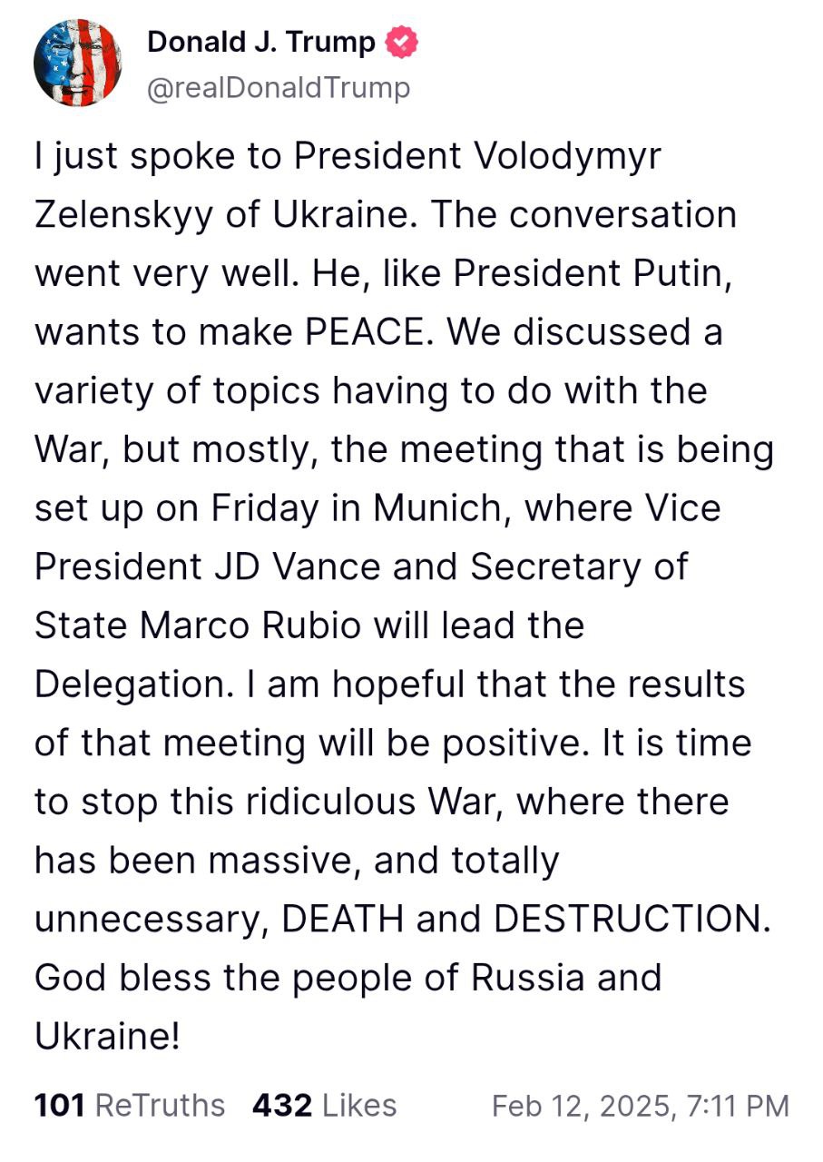 "Я тільки що розмовляв з президентом України Володимиром Зеленським. Розмова пройшла дуже добре. Він, як і президент Путін, хоче укласти МИР. Ми обговорили безліч тем, пов'язаних з війною, але в основному зустріч, яка намічена на п'ятницю в Мюнхені, делегацію очолять віце-президент Джей Ді Венс і державний. Настав час зупинити цю безглузду війну, в ході якої були масові і зовсім непотрібні СМЕРТІ ТА РОЗРУШЕННЯ. – написав Трамп.