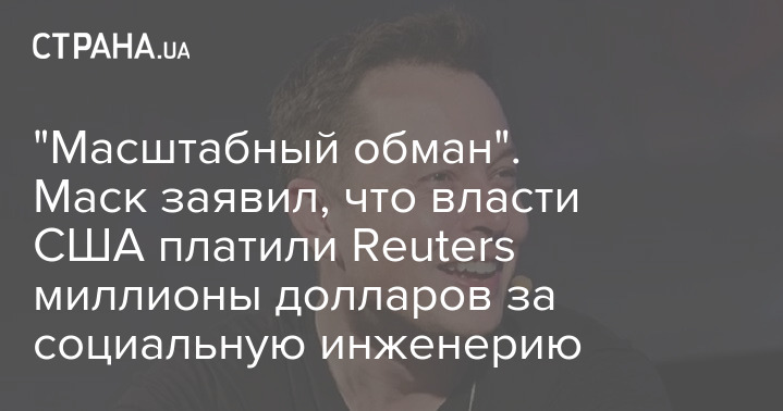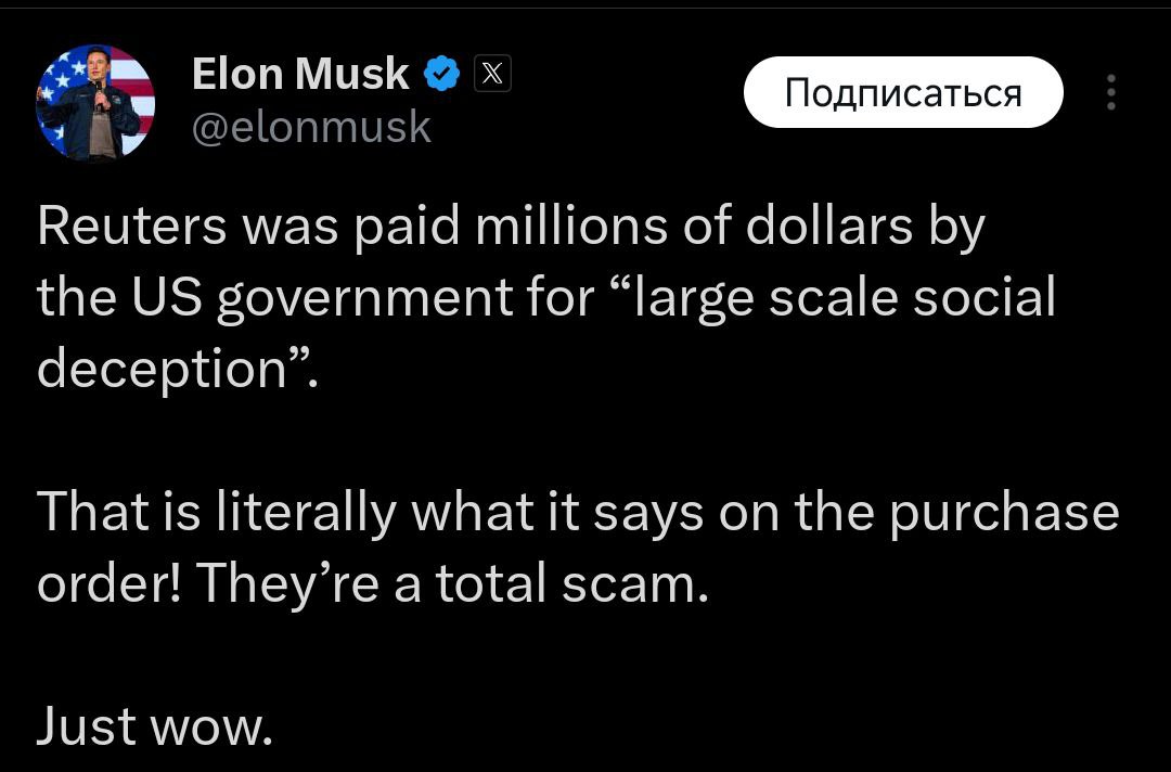 "Уряд США виплатив агентству Reuters мільйони доларів за "масштабний соціальний обман". Це буквально те, що написано у замовленні на покупку!" – написав Маск.