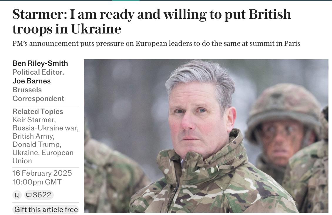 "Великобритания готова играть ведущую роль в ускорении работы над гарантиями безопасности для Украины. Это включает в себя дальнейшую поддержку украинских военных, на которые Великобритания уже выделила 3 ​​​​млрд фунтов стерлингов в год по крайней мере до 2030 года. Но это также означает готовность и желание внести вклад в гарантии безопасности для Украины, разместив наши собственные войска на местах, если это необходимо", - написал он.