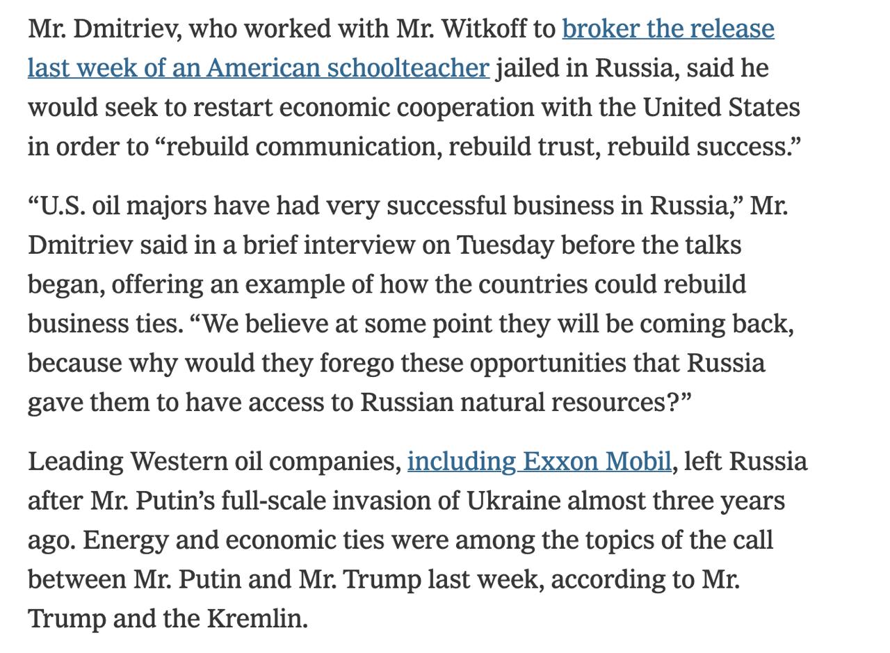 Учасник російської переговорної делегації в Саудівській Аравії, глава Російського фонду прямих інвестицій Кирило Дмитрієв заявив, що РФ прагнутиме відновити економічну співпрацю зі США, щоб "відновити спілкування, відновити довіру, відновити успіх".