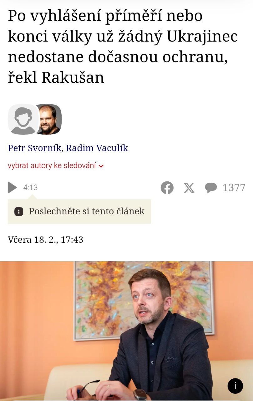 За його словами, з моменту припинення вогню чи війни загалом "жоден українець у Чехії не отримає тимчасового захисту".