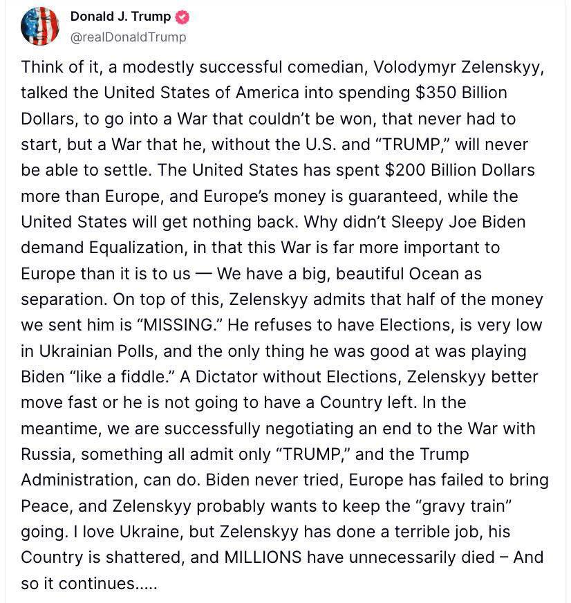 "Подумайте только: скромно успешный комик Владимир Зеленский убедил Соединенные Штаты Америки потратить 350 миллиардов долларов на войну, которую нельзя было выиграть, которая никогда не должна была начаться, но которую он без США и Трампа никогда не сможет урегулировать. США потратили на 200 миллиардов долларов больше, чем Европа, причем европейские деньги гарантированы, а США не получат ничего взамен. Почему же сонный Джо Байден не потребовал выравнивания, ведь эта война гораздо важнее для Европы, чем для нас — у нас есть большой, красивый океан, который нас отделяет. Кроме того, Зеленский признает, что половина денег, которые мы ему отправили, "ПРОПАЛА". Он отказывается проводить выборы, его рейтинги в украинских опросах очень низкие, а единственное, в чем он преуспел — это в том, чтобы "играть" на Байдене, как на скрипке. Диктатор без выборов, Зеленскому лучше поторопиться, иначе у него не останется страны. Тем временем мы успешно ведем переговоры о прекращении войны с Россией — что, по мнению всех, может сделать только Трамп и администрация Трампа. Байден навіть не намагався, Європа не змогла принести світ, а Зеленський, мабуть, хоче, щоб "фінансовий потік" продовжувався. Я люблю Україну, але Зеленський зробив жахливу роботу, його країна зруйнована, і мільйона загинули даремно - і це все триває...", - написав Трамп у своїй соцмережі.
