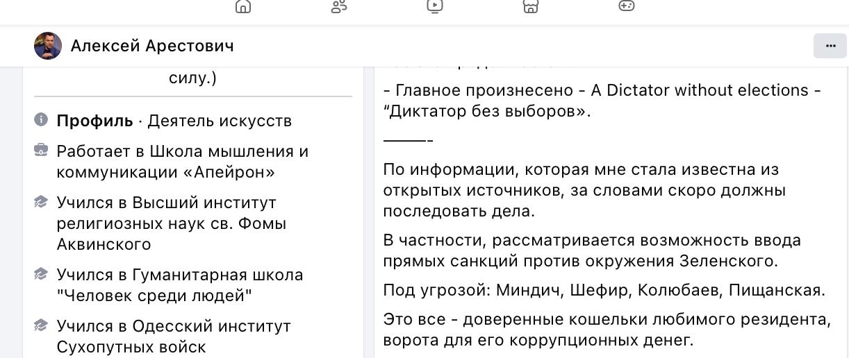 "За інформацією, яка мені стала відома з відкритих джерел, за словами незабаром мають бути справи. Зокрема, розглядається можливість введення прямих санкцій проти оточення Зеленського. Під загрозою: Міндіч, Шефір, Колюбаєв, Піщанська. Це все - довірені гаманці улюбленого резидента, ворота для його корупційних грошей", -.