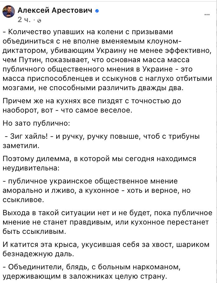 Арестович заявив, що заклики блогерів, підконтрольних Офісу президента, об'єднуватися навколо Зеленського виглядають "аморально та брехливо", оскільки Зеленський "вбиває Україну не менш ефективно, ніж Путін".