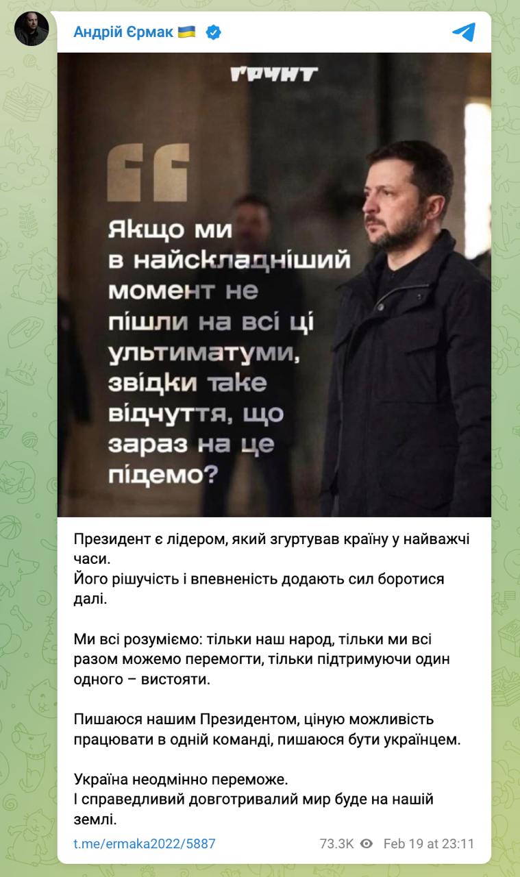 Наприклад, пост про це у своєму телеграм-каналі опублікував голова Офісу президента Андрій Єрмак. Він заявив, що пишається президентом та цінує можливість працювати з ним в одній команді.