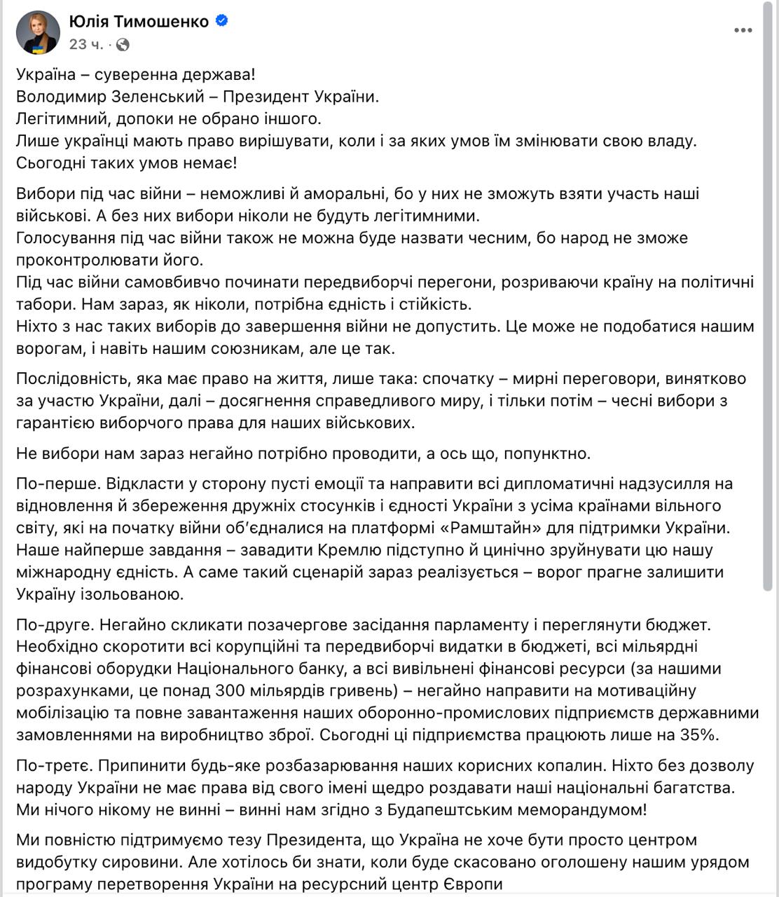 "Володимир Зеленський - президент України. Легітимний, доки не обрано іншого. Тільки українці мають право вирішувати, коли і за яких умов їм змінювати свою владу. Сьогодні таких умов немає!" – написала Тимошенко.