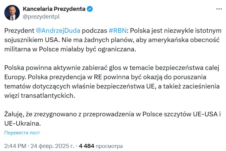 Про це заявив президент Польщі Анджей Дуда, повідомляє у соцмережі Х його канцелярія.