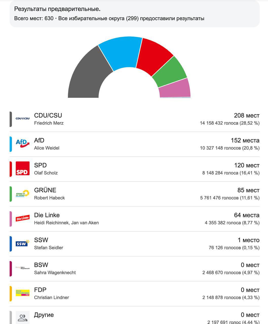 "Виходячи з підсумків виборів у Німеччині, найбільш ймовірна коаліція в новому Бундестазі складатиметься з переможця виборів - ХДС/ХСС Мерца (він стане канцлером) та СДПН Шольца (але вже, швидше за все, без нинішнього канцлера).
