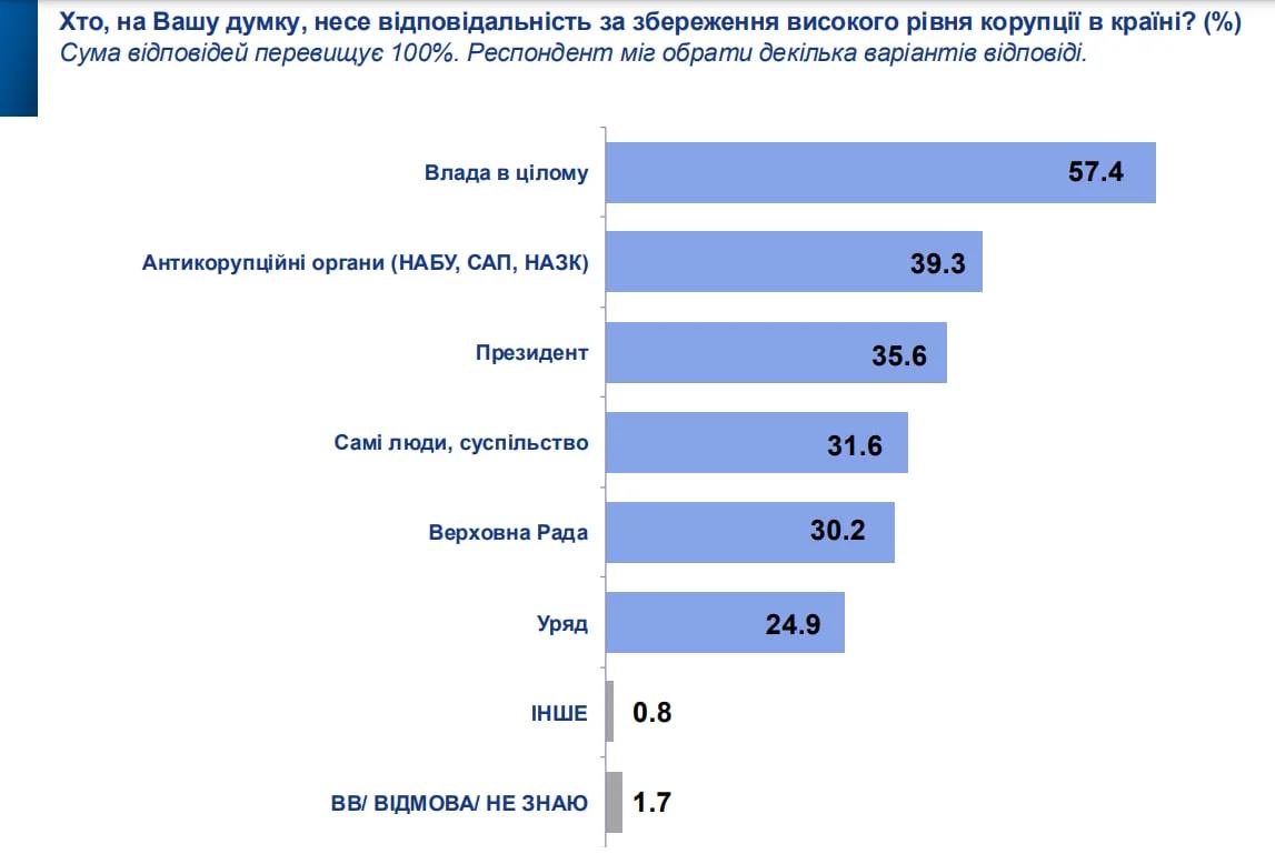 Якщо брати окремі державні інституції, то найбільша відповідальність за високий рівень корупції лежить на антикорупційних органах в особі НАБУ та САП (39,3%), а також на президенті (35,6%).