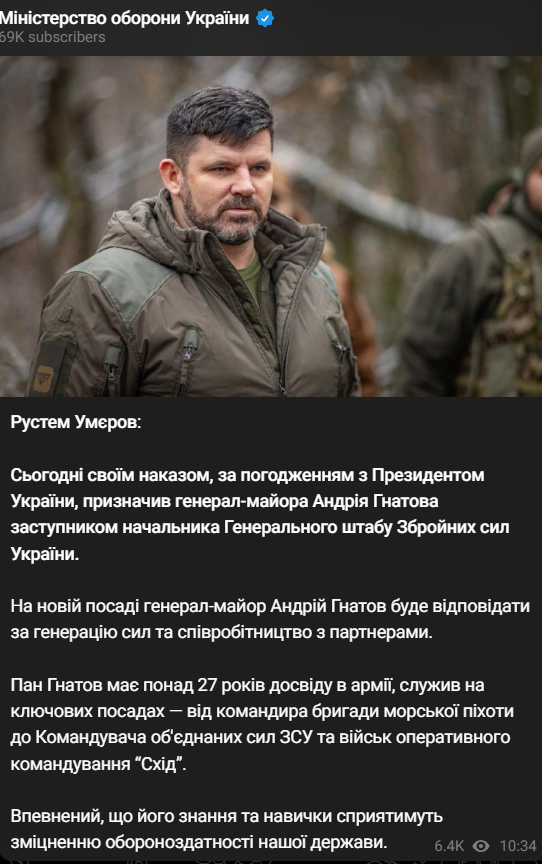 Також він зазначив, що Гнатов має понад 27 років досвіду в армії, служив на ключових посадах – від командира бригади морської піхоти до Командувача об'єднаних сил ЗСУ та військ оперативного командування "Схід".