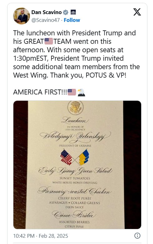Фотографію меню було опубліковано в X заступником керівника апарату Білого дому Деном Скавіно.