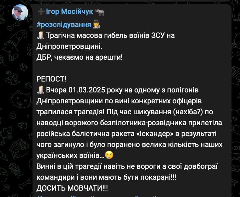 "Вчора, 01.03.2025 року, на одному з полігонів Дніпропетровщини з вини конкретних офіцерів трапилася трагедія! Під час побудови (напевно?) з наведення ворожого безпілотника-розвідника прилетіла російська балістична ракета "Іскандер", внаслідок чого загинула велика кількість, і внаслідок чого загинула велика кількість, і внаслідок чого загинула велика кількість, і внаслідок чого загинула велика кількість, і внаслідок чого загинули українські білітичні ракети "Іскандер".