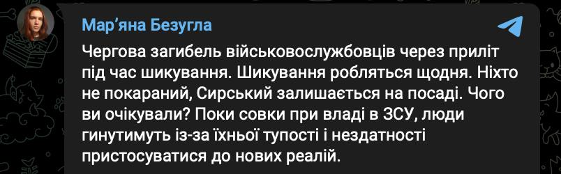 "Чергова загибель військовослужбовців через приліт під час побудови. Побудова проводиться щодня. Ніхто не покараний, Сирський залишається на посаді. Чого ви очікували? Поки совки при владі у ЗСУ, люди будуть гинути через їх тупість і нездатність пристосуватися до нових реалій", - заявила.