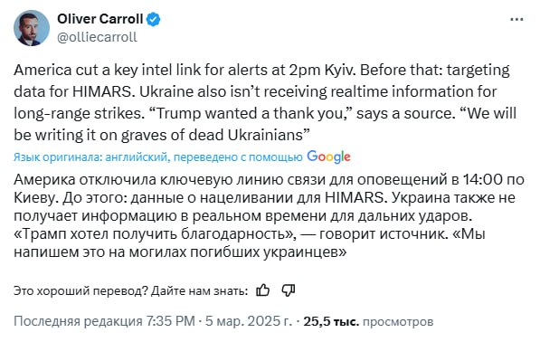 "Америка відключила ключову лінію зв'язку для сповіщень о 14:00 за Києвом. До цього – дані про націлювання для HIMARS. Україна також не отримує інформацію в реальному часі для дальніх ударів", – написав він.