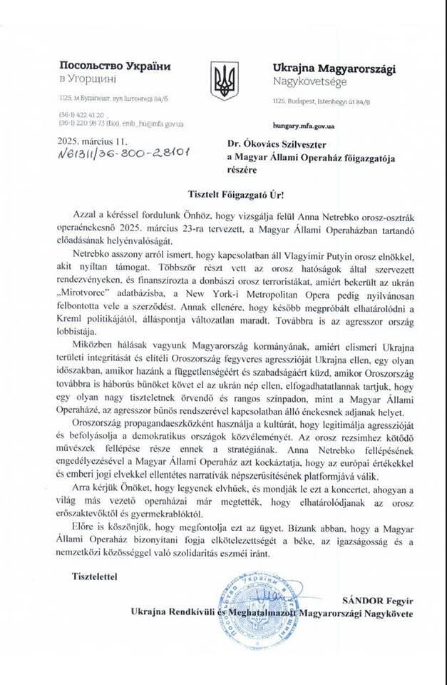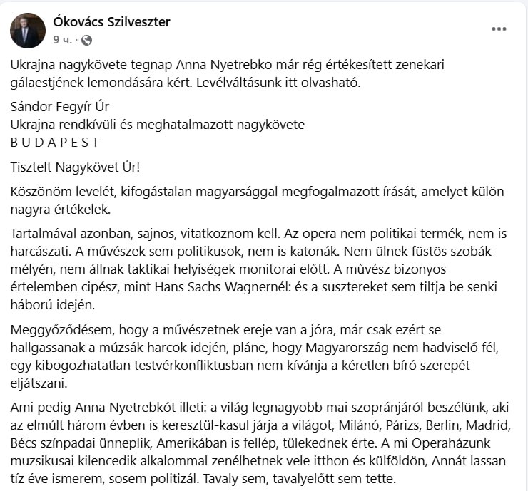 "Я прошу посла не наводити приціл на Угорський державний оперний театр або на спектакль, на який були продані найдорожчі квитки за всю 141-річну історію установи. Це показує, що наші співвітчизники також цінують мистецтво Анни Нетребко... На порозі довгоочікуваного припинення вогню літет найбільшої угорської установи виконавських мистецтв", – додав він.