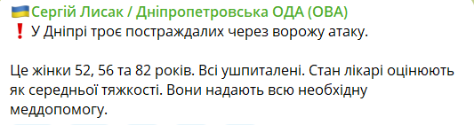 08:40 У Дніпрі вже троє постраждалих через ворожу атаку.