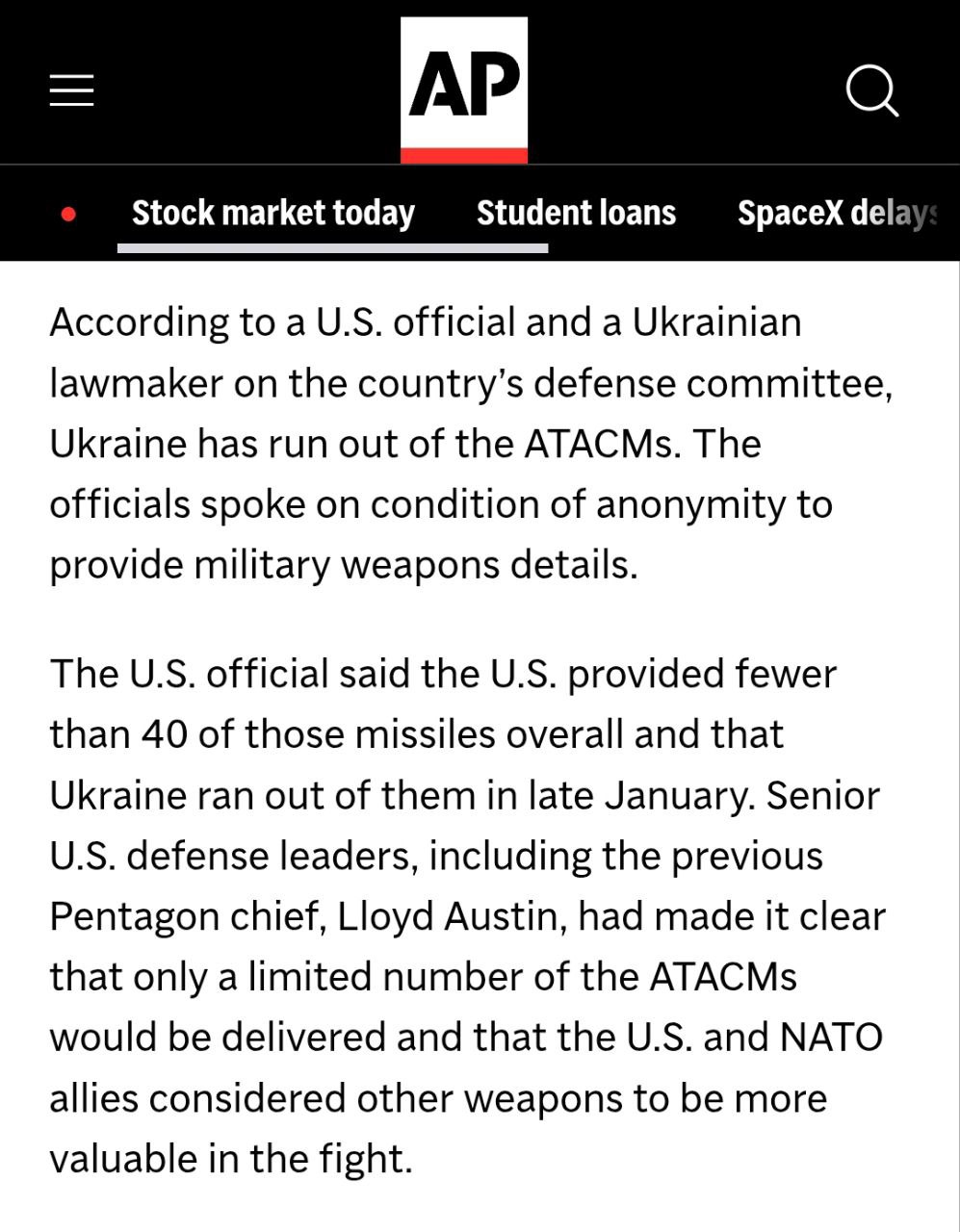 "Американський чиновник заявив, що США поставили менше 40 таких ракет загалом і що вони закінчилися в України наприкінці січня", - повідомляє агентство.