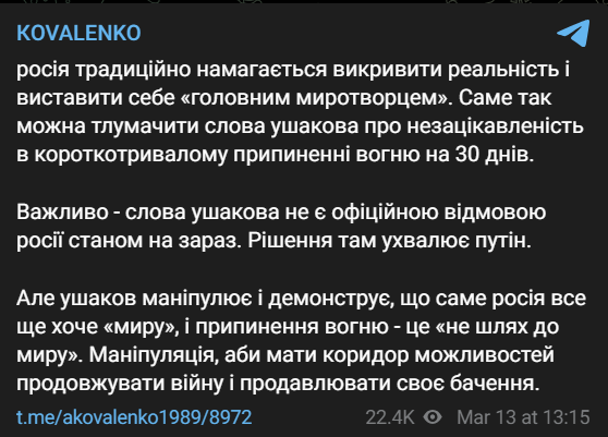 "росія традиційно намагається викривити реальність і виставити себе "головним миротворцем". Саме так можна тлумачити слова ушакова про незацікавленість у короткочасному припиненні вогню на 30 днів.