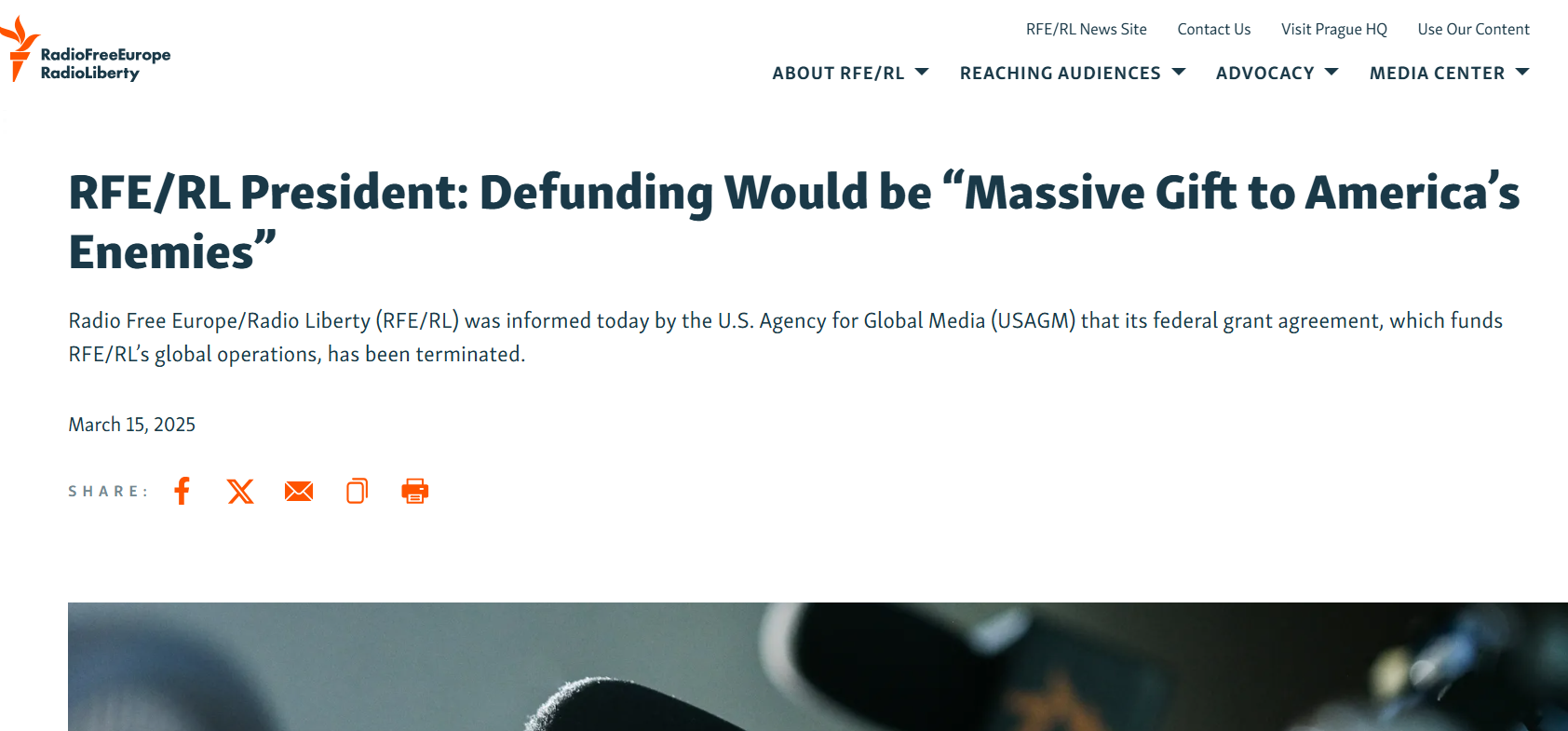 "Радіо Свобода" заявило про припинення свого фінансування з боку уряду США.
