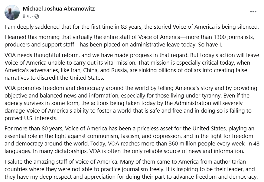 Директор "Голосу Америки" Майкл Абрамовіц повідомив, що це медіа, що фінансується урядом США, повністю припиняє роботу, а весь персонал разом з ним вирушає "в адміністративну відпустку".