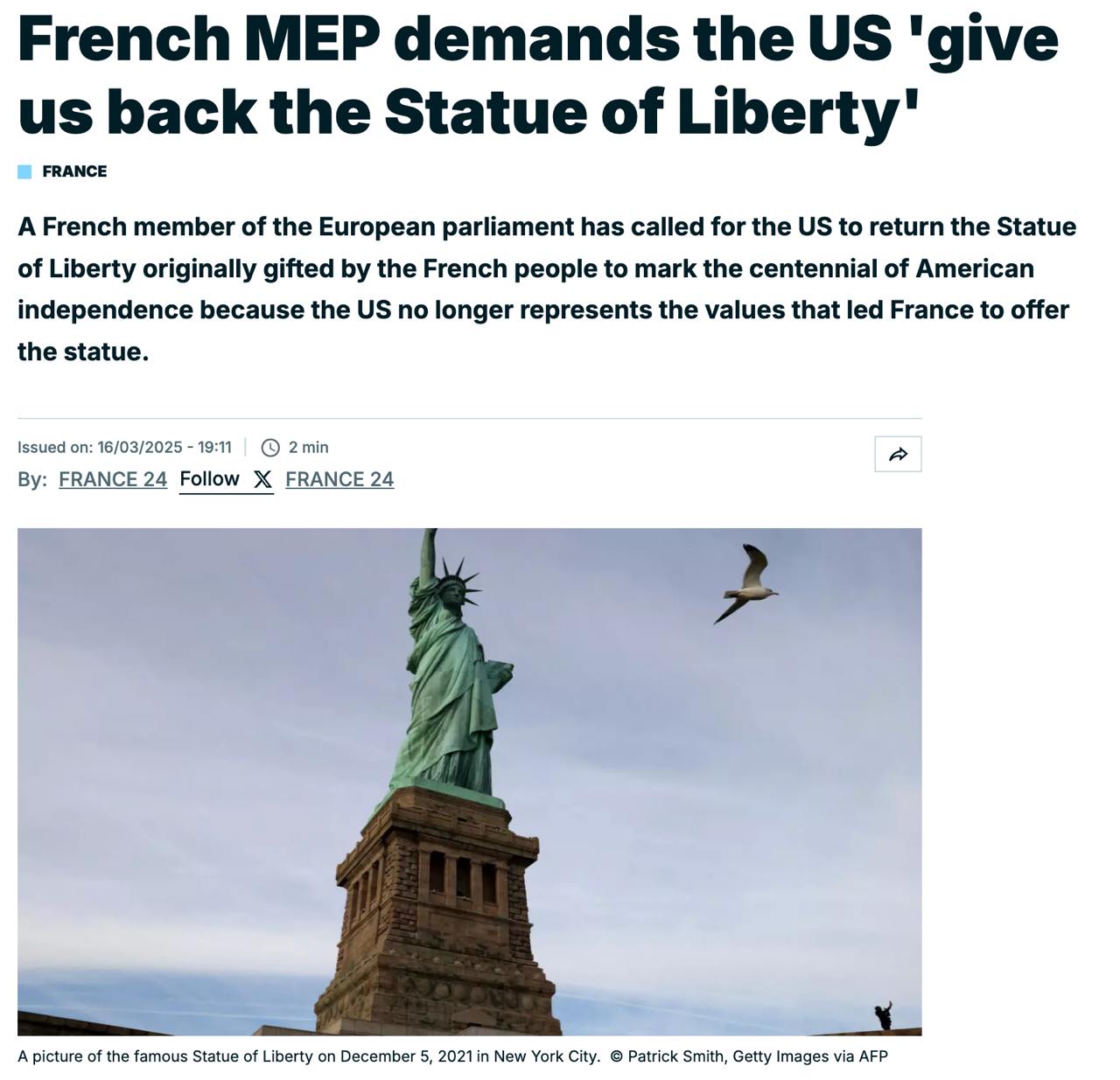Нагадаємо, французький депутат Європарламенту Рафаель Глюксман закликав США повернути Статую Свободи, подаровану Парижем у XIX столітті.