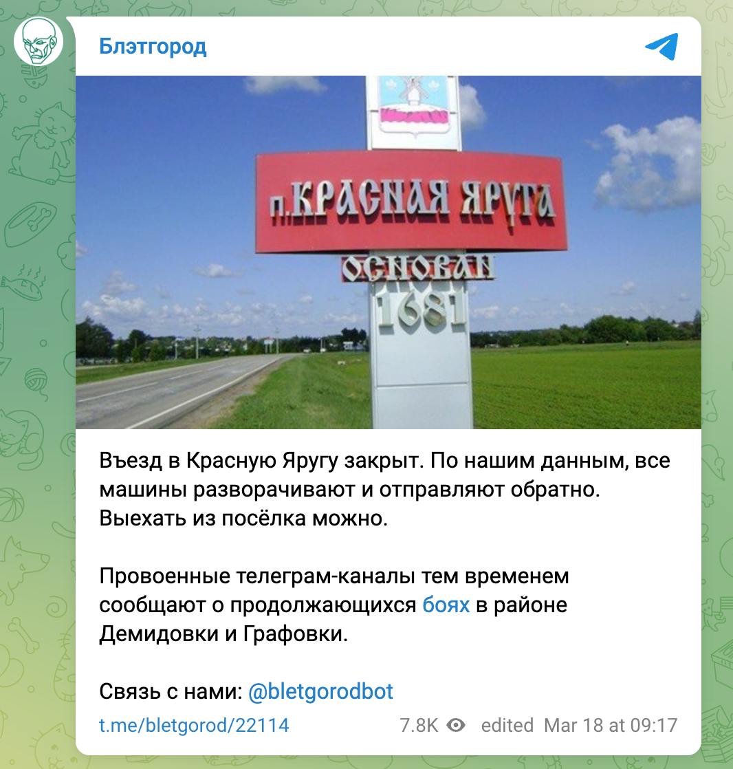 09:31 У Білгородській області РФ, де йдуть повідомлення про спробу настання ЗСУ, закрили в'їзд до Червоної Яруги, повідомляють місцеві паблики.