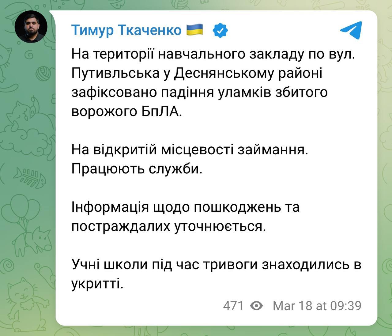 09:47 Усі учні київської школи, на території якої впали уламки дрону, перебували в укритті, повідомляє голова КДВА Тимур Ткаченко.