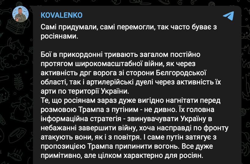 "Самі вигадали, самі перемогли. Бої у прикордонних продовжуються в цілому постійно протягом широкомасштабної війни, як через активність інших ворогів з боку Білгородської області, так і артилерійські дуелі через активність їхньої арти територією України", - написав голова "Центру боротьби з дезінформацією".
