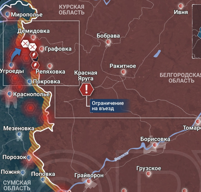 Міноборони РФ вчора ввечері завило, що відбито спробу настання ЗСУ (5 атак) на Білгородську область. МО РФ це пов'язало з намірами України "створити негативне тло навколо переговорів президента Росії та США".