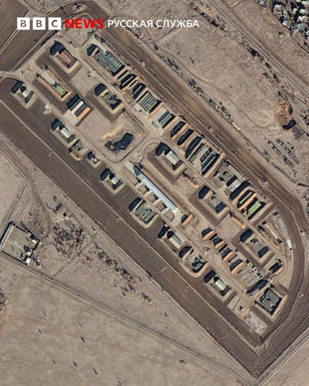Будівлі на території складу оточені земляним валом, який необхідний для запобігання розповсюдженню пожежі та розльоту уламків. Усередині одних ділянок, обгороджених валами, видно будівлі. Об'єкти всередині інших ділянок більше схожі на ящики, складовані просто неба.
