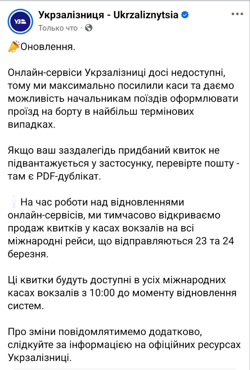 Через масштабний збій компанія відкрила більше квиткових кас. Зазначається, що до відновлення онлайн-систем квитки на всі міжнародні рейси, що відправляються 23 і 24 березня, можна придбати також у касах вокзалів.