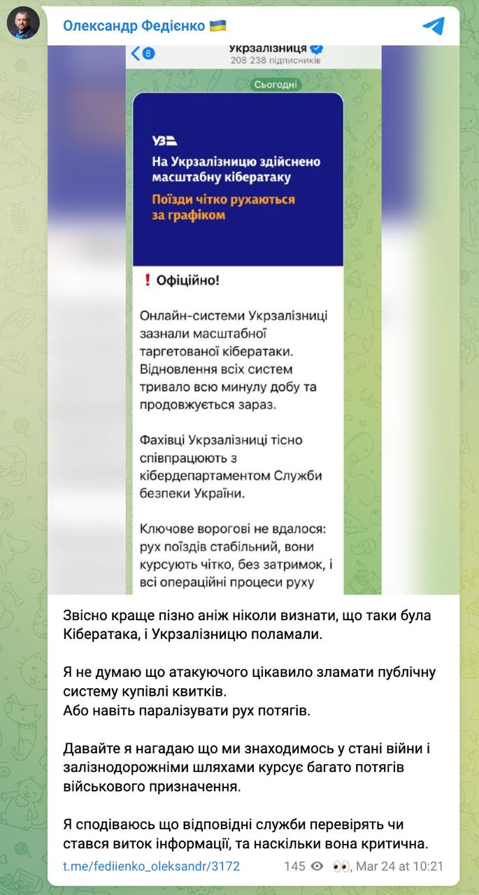 Тим часом, народний депутат Олександр Федієнко натякає, що метою російської кібератаки на "Укрзалізницю" могла бути інформація про рух військових поїздів.