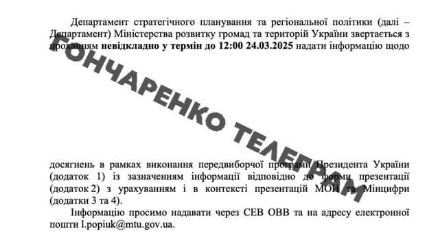 "Департамент стратегічного планування та регіональної політики Міністерства розвитку громад і територій України звертається з проханням терміново, у строк до 12:00 24.03.2025 надати інформацію про досягнення в рамках виконання передвиборної програми президента України зі згадуванням інформації відповідно до форми презентації та з урахуванням та у контексті презентацій", - йдеться у наведеному запиті.
