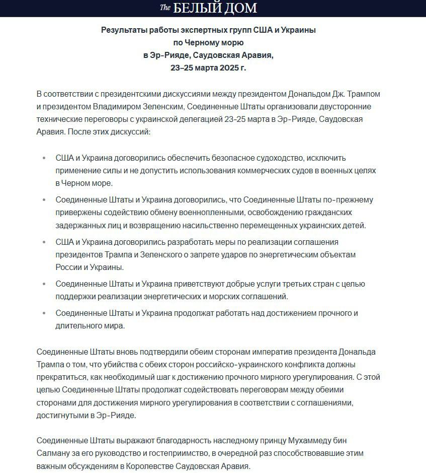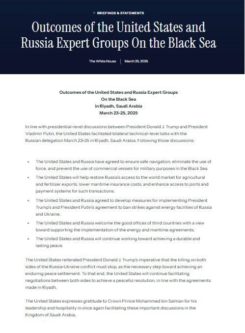 "Відповідно до переговорів на президентському рівні між президентом Дональдом Трампом і президентом Володимиром Путіним Сполучені Штати організували двосторонні технічні переговори з російською делегацією 23–25 березня в Ер-Ріяді, Саудівська Аравія. За підсумками обговорень: