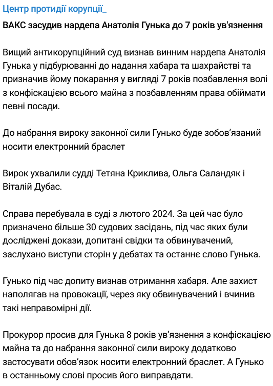 ВАКС визнав винним нардепа Анатолія Гунька у здирництві та отриманні хабара у розмірі 85 тисяч доларів і призначив йому покарання у вигляді семи років позбавлення волі з конфіскацією всього майна з позбавленням права обіймати певні посади.