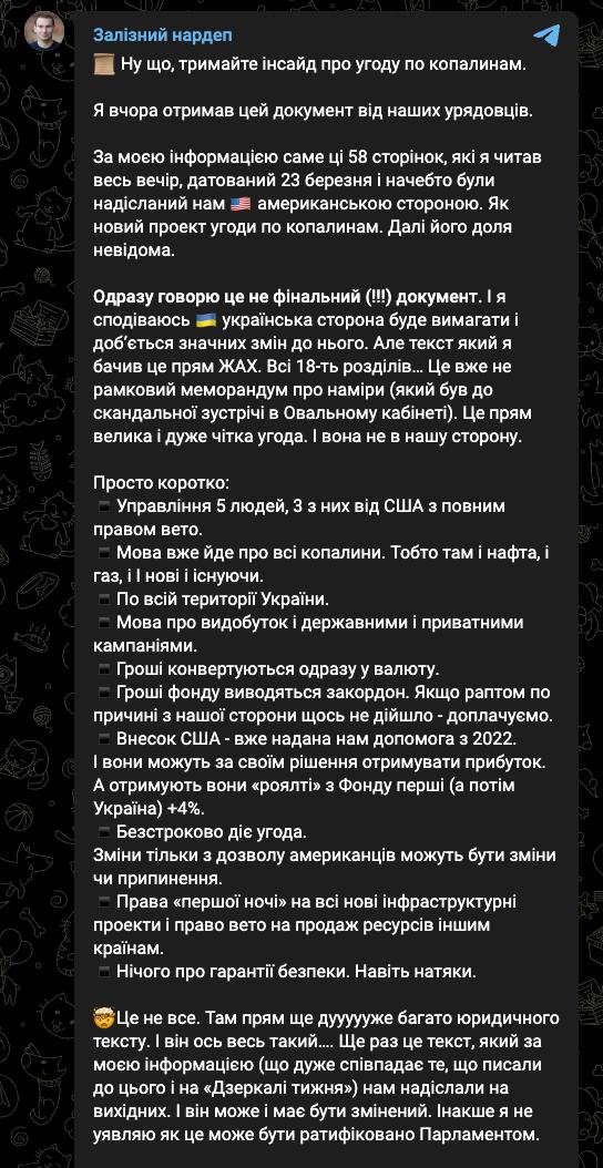 Як пише нардеп, запропонована США угода щодо надр "не на нашу користь". Він заявляє, що в ньому йдеться про всі корисні копалини, причому як про нові, так і про родовища, що вже розробляються.