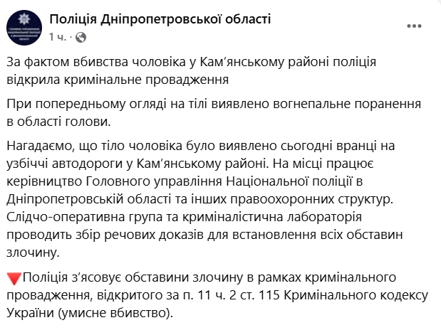 У Кам'янському районі Дніпропетровської області сьогодні вранці на узбіччі знайшли чоловіка. На тілі виявлено вогнепальне поранення в ділянці голови.